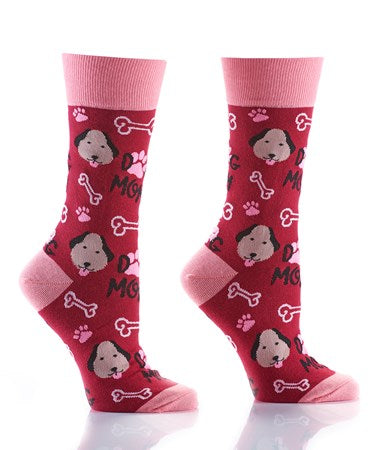 Women's Crew Sock with Dog and Bone Design and DOG MOM sentiment. Dark red sock, peach heel, cuff and toe. Compact Cotton and anti-microbial. Reinforced deep pocket heel and toe. Fits Women's Shoe Size 6-10.